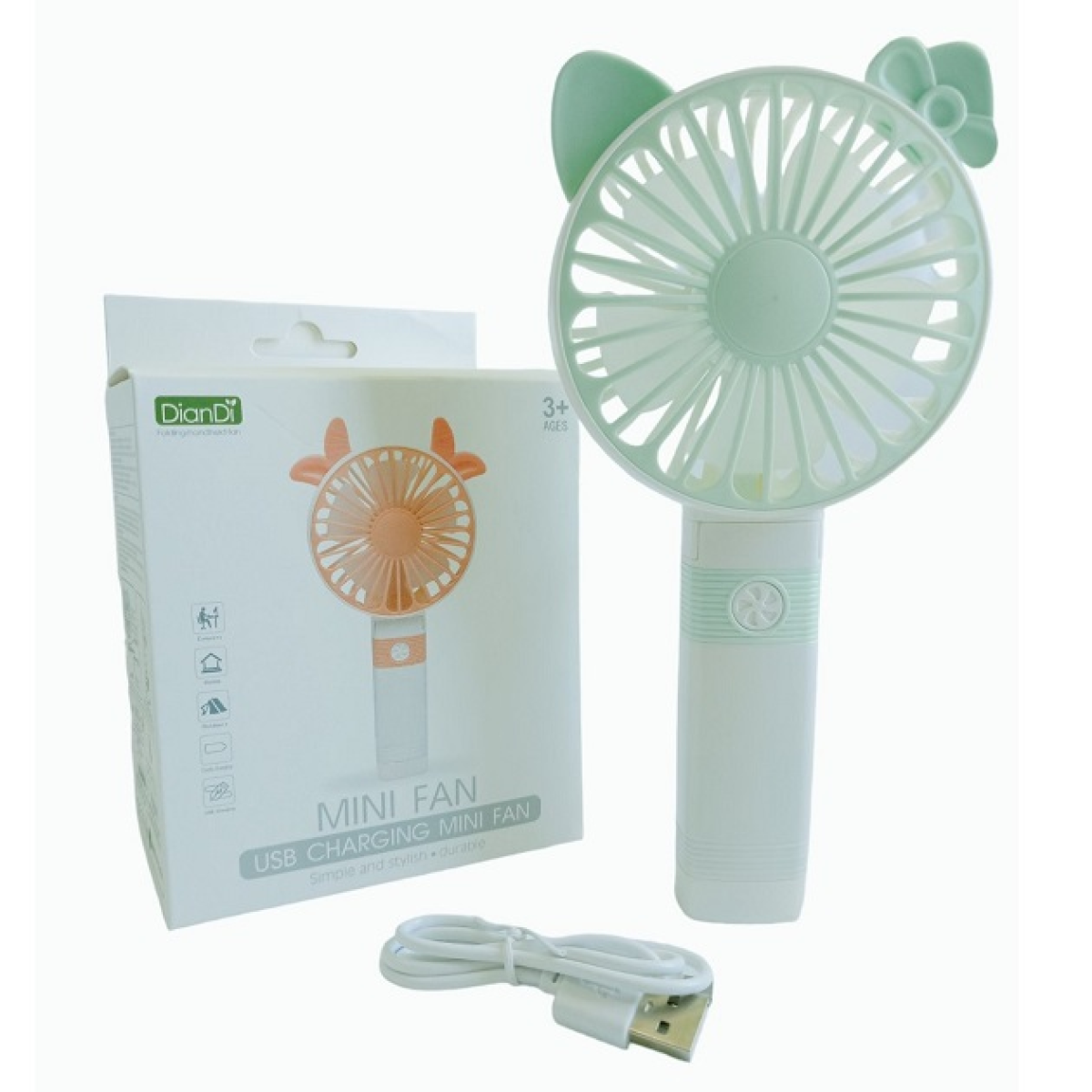 А також це стильний, молодіжний аксесуар з вушками на головці вентилятора, компактний за своїми розмірами і дуже простий у використанні. Акумуляторний вентилятор Mini Fan SQ-2163 є вентилятором-трансформером, який можна використовувати як ручний вентилятор, а якщо скласти ручку, то він стане компактним настільним вентилятором. Ручний вентилятор SQ2163 працює на двох швидкостях, які можна легко перемикати за допомогою кнопки на передній стороні ручки даного приладу. Для максимальної сили дії вентилятор має пропелер на п'ять лопатей, які створюють потужний спрямований повітряний потік для досягнення максимальної користі роботи ручного вентилятора.