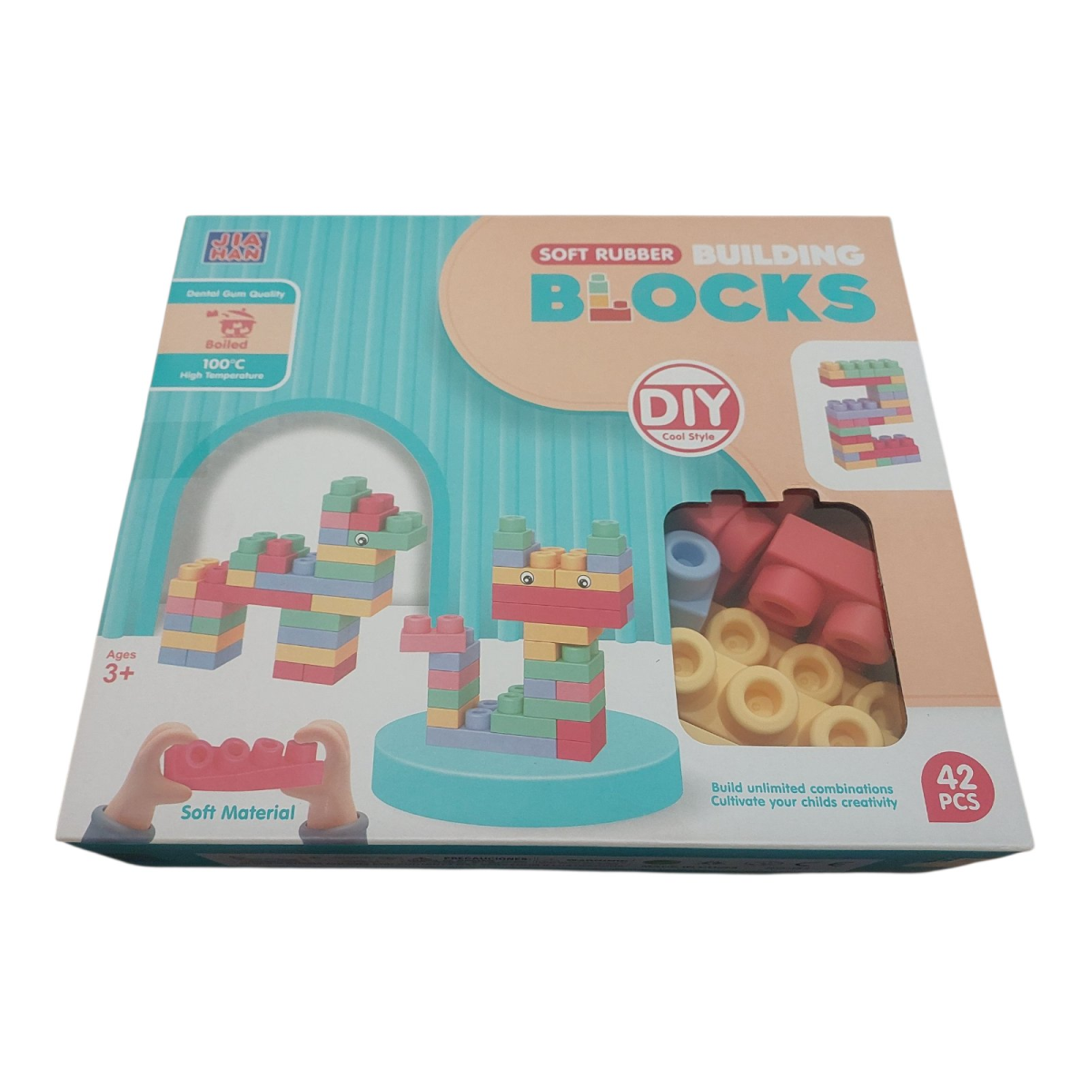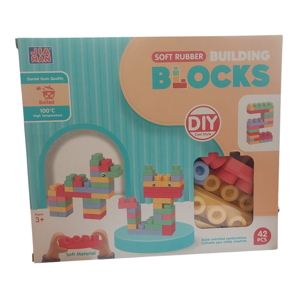 Включає 42 великі деталі, що відрізняються за розміром, кольором та формою. Всі елементи виконані з щільної гуми, тому їх можна згинати і спробувати навіть за смаком. Деталі не мають гострих кутів, повністю безпечні для дітей та можуть бути простерилізовані.